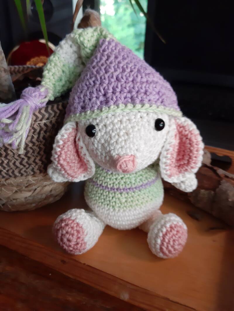 Om te beginnen wil ik nog/(weer) ;) even zeggen hoe helpend het is om met mijn hobby'tje bezig te zijn in tijden dat alles om me heen moeilijk, ingewikkeld is. En ja, eerlijk toegegeven; toch ook soms ellendig en zwaar. Maar ik laat mijn koppie niet hangen en probeer zo goed en zo kwaad als het gaat mijn hoofd boven water (lees: úit een psychose) te houden. Vooral haken is meditatief voor me en ondertussen levert het dan soms mooie, leuke of schattige werkjes op. Win-win, toch?